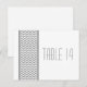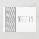 Postal con número de tabla de borde Chevron y moda moderna con un sencillo borde de patrón de chevron en gris y blanco. Este diseño elegante marcará el tono de una boda elegante. Fácil de personalizar, simplemente agregue los números de tabla apropiados en el campo de texto proporcionado. Haga clic en "Personalizar" para encontrar más opciones de personalización.