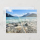 Hermosa tarjeta postal de simpatía de fotografía de paisaje con montañas, vista al lago y superposición de arcoíris y una cita cristiana sincera de simpatía en la parte posterior de la siguiente manera: "Dios nos recuerda en nuestro dolor y su amor fiel dura por siempre!"