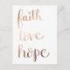 "Faith Love Hope" está escrito a mano con Relieve metalizado dorado en una postal blanca. Volver está en blanco para mensajes personales y dirección.