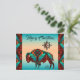 ¡Personalice esta tarjeta postal de Navidad del suroeste de Búfalo "única"! Cuenta con un suroeste de Búfalo y sol en un fondo de puesta de sol turquesa y naranja... rodeado de un borde turquesa, naranja y negro. Diseño artístico original del artista Kerry Miller.