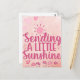 ¡Difunde amor y alegría con la tarjeta postal Enviando un poco de sol! Esta hermosa tarjeta de alta calidad ha sido impresa en papel premium y está adornada con colores vibrantes e inspiradores que llevarán un poco de sol a cualquier habitación. Muestra tu estilo mientras haces sonreír a alguien con esta tarjeta inspiradora. Es perfecta para cualquier ocasión. ¡Consigue la tuya hoy y comienza a enviar un poco de sol!