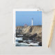 Faro en Point Arena, California. Las olas chocan contra la costa rocosa bajo los acantilados. Cielo azul brillante.