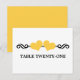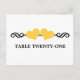 Postal con el número de la mesa Boda de Corazones Elegantes, dulce y caprichoso, con un elegante borde giratorio adornado con un par de corazones amarillos con el canto de los limoneros. Esta moderna tarjeta de mesa es la elección perfecta para una moda y una boda elegante. Fácil de personalizar, simplemente agregue los números de tabla apropiados en el campo de texto proporcionado. Haga clic en "Personalizar" para buscar opciones de personalización adicionales.