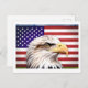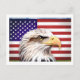 Una tarjeta postal con un águila hermosa y fuerte frente a una clásica bandera de EE. UU.