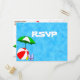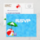 Una plantilla de tarjeta postal personalizada de confirmación de asistencia a fiesta en la playa o piscina con una pelota de playa y una sombrilla en un lado y espacio para la dirección de devolución y la información del invitado en la parte posterior en letras divertidas. Personalízala para cambiar las fuentes, el tamaño y más, incluso guarda tu diseño para más adelante.