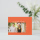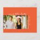 Las líneas limpias de este diseño moderno acentúan tu hermosa foto. Agrega tu imagen y personaliza la tarjeta postal como desees. Colores personalizados a petición. Se muestra en naranja con texto blanco.