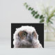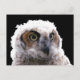 Cara de búho joven en primer plano. Grandes ojos amarillos en discos faciales marrones sobre un pico negro afilado. La parte superior de la cabeza y el contorno del cuerpo están resaltados por la luz del sol que ilumina el plumón de este búho joven.