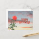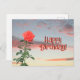 Una sola rosa rosa en un tallo verde frondoso, se sostiene contra un cielo de puesta de sol. Cielo dorado en la parte inferior y cielo gris azulado en la parte superior. Nubes rosadas y grises están dispersas por el cielo. "Feliz cumpleaños" está en texto rosa con una sombra paralela negra (puede editarse según tus sentimientos).