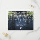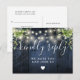 Una cuerda ilumina madera de granero azul rústico con una tarjeta RSVP de boho verde con tipografía de moda. El reverso cuenta con tus detalles y una divertida petición de canciones de invitados. Diseñado por Thisisnotme©