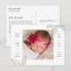 Esta postal botánica de anuncio de nacimiento de recién nacido presenta un diseño sencillo y moderno. En la parte delantera de la postal, una gran foto cuadrada está enmarcada por texto en un diseño único. Las hojas dibujadas a mano enmarcan el diseño. Personalice el nombre del recién nacido, la fecha de nacimiento, las estadísticas de nacimiento y sus nombres. En la parte posterior, puede escribir un mensaje personalizado a los destinatarios.