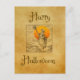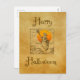 Una bruja vintage de Halloween con escoba y una luna naranja llena de Halloween, deseándote un feliz Halloween.