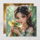 A pretty anime elven fairy holding her cute green and gold baby dragon blank card.