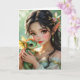 A pretty anime elven fairy holding her cute green and gold baby dragon thinking about you friend card.