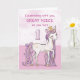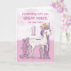 Un dulce poni rosa como tu sobrina nieta está bailando con el número uno! Los detalles con apariencia dorada están tejidos en su crin y cola. ¡Tarjeta perfecta para desearle a tu sobrina nieta su primer cumpleaños!
