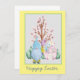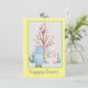 gnomo de estilo tomate color agua dulce con ramo de flores primavera dulce, un hogar con forma de huevo, árbol floreciente y fondo amarillo pastel con texto de personalizable "Pascua feliz".