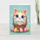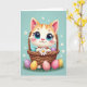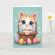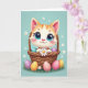 En la parte delantera de la tarjeta, un gatito animado con rayas naranjas y ojos azules enormes se sienta cómodamente en una cesta tejida, sus mejillas suavemente sonrosadas mientras mira hacia afuera con una mirada tierna y amigable 🌷. Las pequeñas patas del gatito sostienen una margarita blanca cerca, como un pequeño regalo silencioso ofrecido a alguien especial. La cesta está llena de formas de huevo moteadas y de colores brillantes, y algunas han caído sobre la hierba verde debajo, lo que añade una sensación de momento casual y compartido. Detrás de la escena, un fondo azul pastel brilla con luz suave y está salpicado de pequeñas flores blancas que flotan como confeti de primavera. Cerca de la parte superior, un breve saludo de Pascua aparece en letras redondeadas, en blanco con un contorno rosa claro para que se destaque contra el fondo azul cielo 🐇. La sombra sutil da al pelaje y a la textura de la cesta una profundidad suave, mientras mantiene la apariencia general ligera y aireada. En el