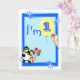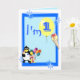 1.ª tarjeta de cumpleaños con payaso divertido, pingüino, helado y globos, de fondo azul. Personalice fácilmente este diseño agregando o cambiando el texto.