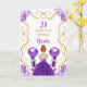 Esta tarjeta de cumpleaños tiene un marco dorado elegante, una bella princesa con el pelo rojo y un vestido morado, flores y un globo.