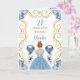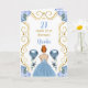 Esta invitación a la tarjeta de cumpleaños incluye un marco dorado elegante, una bella princesa con el pelo rojo y un vestido azul polvoriento, flores y un globo.