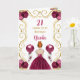 Esta invitación a la tarjeta de cumpleaños incluye un marco dorado elegante, una bella princesa con el pelo rojo y un vestido rojo borgoña, flores y un globo.