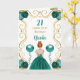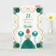 Esta invitación a la tarjeta de cumpleaños incluye un marco dorado elegante, una bella princesa con el pelo rojo y un verde azulado vestido azul, flores y un globo.