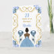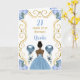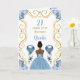 Esta invitación a la carta de cumpleaños incluye un marco dorado elegante, una bella princesa con piel oscura y un vestido azul polvoriento, flores y un globo.