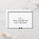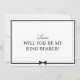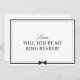 Pon la pregunta en tu pequeño portador de anillo con esta minimalista carta con temática de bowtie. Perfecto para un boda moderno, este diseño de moda en blanco y negro presenta un sencillo borde con un elegante gráfico de bowtie en la parte inferior. El elegante y limpio estilo lo convierte en una opción ideal para quien desee añadir un toque de encanto clásico a su propuesta de celebración de bodas. Personalizar con el nombre de su portador de anillo por un toque personal que encaja perfectamente en cualquier tema boda, ya sea formal, casual o en algún lugar intermedio. Esta tarjeta añade un toque de sofisticación, mientras que la mantiene divertida y amigable con los niños.