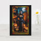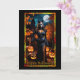 Esta impresionante tarjeta de Halloween muestra una imagen cautivadora de una mujer vestida con un elegante disfraz de gato negro, que representa el encanto y el misterio de la temporada. La mujer se mantiene confiada bajo el resplandor de una luna llena, rodeada de brillantes lámparas jack-o' y vibrante follaje otoñal. Su maquillaje, con rasgos afilados como un gato, agrega una capa extra de intriga a su ya sorprendente apariencia. El fondo, con un ambiente oscuro y evocador y una mansión espeluznante de silueta, se completa perfectamente con el tema general.