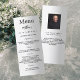 Tarjeta de menú de la fiesta de cumpleaños tanto para él como para ella. Personalice y agregue un nombre, edad, fecha y el menú. Un fondo falso plateado. Letras de color negro. Atrás: agrega una foto del tipo de cumpleaños, datos divertidos