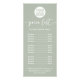 Este moderno menú de precios en blanco y verde sabio presenta una elegante tipografía escrita a mano. También puede añadir su propio logotipo de personalizado a la parte superior. La parte principal de la tarjeta contiene su lista de servicios con los precios correspondientes, para un aspecto elegante que funciona tanto para un negocio corporativo como para su pequeño negocio creativo, incluyendo a cualquiera en el negocio de la belleza, el cabello, las uñas o azotes, así como profesiones elegantes como el diseño interior y los bloggers.