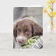 El espátula espaniel brillante aguantando la cabeza en una tarjeta de felicitación de cumpleaños para zapatos