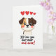 This greeting card shows a cartoon puppy’s head and upper body centered on a plain white background. The pup has creamy white fur with warm tan and chocolate-brown patches, plus rosy blush on its cheeks and a sweet, slightly shy expression. Its big black eyes have tiny white highlights, making it look sincere and attentive. Above the puppy, four red hearts float like a little halo, getting smaller from left to right to suggest a gentle shower of love ❤️. Beneath the illustration, the card reads “I’ll love you fur-ever and ever!” in a hand-lettered style that feels casual and friendly. The words “and ever!” stand out in red, matching the hearts and tying the message together 💌. With its simple layout and affectionate theme, it’s a lovely way to celebrate loyalty and care, especially with a little nod to sweets like 🍫. Hope it helps you share heartfelt Valentine’s Day sentiments with someone you care about.