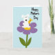 This card shows a large, stylized flower with wide, rounded purple petals circling a bright yellow center, like a sunny stage for a sweet little scene. A bigger white animal with tiny black dot eyes and a small black snout sits on the yellow center, angled toward a smaller golden-yellow animal perched nearby on a petal. Their close spacing and gentle, attentive pose suggest a caring bond, like quiet friendship or a soft, affectionate moment ❤️. A green stem runs down from the bloom with two simple leaves, keeping the composition grounded and tidy. Behind everything is a smooth pale blue sky that stays flat and uncluttered, letting the characters and flower carry the mood. In the upper right corner, a short celebratory message appears in a flowing, hand-drawn style, set in a dark ink color that stands out clearly against the blue background 🌼. The colors stay bright yet soft—blue, purple, yellow, white, and green—with minimal shading and no busy texture, giving the illustration a storybook-like look. The flower’s yellow center is circular and radiant, with the white animal seated right on top and the smaller golden-yellow animal resting on the nearest purple petal.