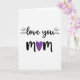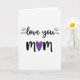 This greeting card features the words “love you Mom” centered on a plain white background. The message is split across two lines, with “love you” on top and “Mom” underneath. “Love you” is written in flowing black lettering that looks like it was drawn with a brush, and small dash marks sit to the left and right to add a little emphasis. Below that, “Mom” appears in thicker black lettering, and the “o” is replaced by a deep purple heart that stands out right away. The purple heart becomes the main focus and makes the whole design feel extra caring ❤️. With just a few elements and lots of open space, it feels honest and easy to read, like something you truly mean. It’s a sweet way to show your love and share Valentine’s Day sentiments 🥰.