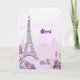 Diga méritos a sus huéspedes con esta tarjeta de bienvenida color morado de bonito perfecta para un evento especial de París. La Torre Eiffel está rodeada de hermosos iris violetas, con una silueta parisina en el horizonte. Utilícelo como tarjeta de agradecimiento o tarjeta de felicitación general para una ducha de novia parisina, una ducha de bebé, una fiesta de cumpleaños, una fiesta de compromiso, un boda u otra ocasión de moda. Disponible con elementos coincidentes.