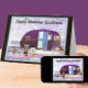 Fun vintage travel camper Happy Birthday card. The retro-style travel trailer is in a beach setting with a picnic table and camping supplies nearby. The trailer and the beach scene are designed in rich purples, bright blues, and shades of white. The inside message reads: I hope your birthday is full of happiness and the coming year provides wonderful fun-filled adventures. Happy Birthday!