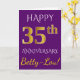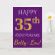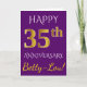 Este diseño simple y personalizado de tarjeta de felicitación de aniversario de bodas presenta el mensaje "FELIZ 35 ANIVERSARIO", con el "35" teniendo una apariencia similar al oro falso. La parte frontal también presenta un nombre personalizado y un fondo de color púrpura. El interior presenta un mensaje de felicitación de aniversario de bodas personalizado. Se puede dar a un esposo o una esposa en celebración del trigésimo quinto aniversario de bodas de la pareja. [~Z0000089]
