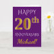 Este diseño de tarjeta de felicitación de aniversario de boda simple y personalizado presenta el mensaje "FELIZ 20º ANIVERSARIO", con el "20º" que tiene una apariencia similar al oro. La parte delantera también presenta un nombre personalizado y un fondo de color púrpura. El interior presenta un mensaje de felicitación de aniversario de boda personalizado. Se podría dar a un esposo o una esposa en celebración del vigésimo aniversario de boda de la pareja.
