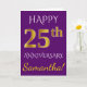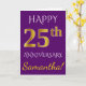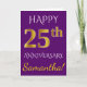 Este diseño de tarjeta de felicitación de aniversario de boda simple y personalizado presenta el mensaje "FELIZ 25º ANIVERSARIO", con el "25º" que tiene una apariencia similar al oro. La parte delantera también presenta un nombre personalizado y un fondo de color púrpura. El interior presenta un mensaje de felicitación de aniversario de boda personalizable. Se podría dar a un esposo o una esposa en celebración del vigésimo quinto aniversario de boda de la pareja. [~Z0000089]