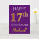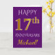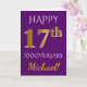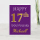 Este diseño de tarjeta de felicitación de aniversario de boda simple y personalizado presenta el mensaje "FELIZ 17º ANIVERSARIO", con el "17º" que tiene una apariencia similar al oro. La parte delantera también presenta un nombre personalizado y un fondo de color púrpura. El interior presenta un mensaje de felicitación de aniversario de boda personalizado. Se podría dar a un esposo o una esposa en celebración del decimoséptimo aniversario de boda de la pareja. [~Z0000089]