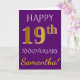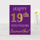 Este diseño simple y personalizado de tarjeta de felicitación de aniversario de bodas presenta el mensaje "FELIZ 19º ANIVERSARIO", con el "19º" que tiene una apariencia similar al falso oro. La parte delantera también presenta un nombre personalizado y un fondo de color púrpura. El interior presenta un mensaje de felicitación de aniversario de bodas personalizable. Se puede dar a un esposo o una esposa en celebración del decimonoveno aniversario de bodas de la pareja. [~Z0000089]
