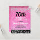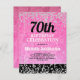 Invitación divertida a la fiesta de cumpleaños número 70 para mujeres de color rosa brillante sobre negro con purpurina brillante de plata. Puedes personalizar el texto de esta tarjeta para una fiesta de cumpleaños por cualquier edad que estés celebrando.