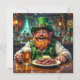 Una linda tarjeta del día de San Patricio con un duende en un pub bebiendo cerveza y comiendo carne de res salada con repollo. La parte trasera de la tarjeta se puede personalizar con tu propio saludo o mensaje del día de San Patricio.