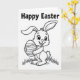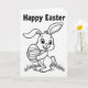 This card features a black-and-white line drawing of an upright cartoon rabbit centered near the lower middle, smiling with bright eyes and slightly tilted head, as if sharing a sweet, friendly moment with whoever opens it 🐰. Its long ears stand up with light shading inside, and the rounded cheeks and open grin give it an affectionate, welcoming look. The rabbit holds a decorated oval egg close to its body like a small gift, with wavy and straight bands wrapping around it in neat patterns. Simple tufts of grass sit under its feet, suggesting a springtime lawn without adding extra background clutter. Across the top, a large greeting appears in thick, easy-to-read uppercase letters, set in black against the white space. The open area around the character keeps the focus on the rabbit and the egg, and the minimal linework feels like a coloring-page style design 🌷. Fine contour lines define the rabbit’s paws, belly, and tail, while the egg’s stripes alternate between curved and straight sections. The composition stays monochrome, with the rabbit’s perked ears, grassy strokes, and patterned oval egg clearly outlined beneath the top text.