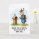 This card shows a cheerful, human-like rabbit dressed as a mail carrier, wearing a sky-blue uniform and matching cap, with a brown shoulder satchel hanging at its side 🐰. The rabbit’s bright blue eyes and soft smile suggest it’s delivering a note meant for someone special, like a quiet gesture of friendship or romance. Slightly to the left sits a rustic wooden mailbox, and the rabbit holds a pale yellow envelope close, as if pausing before slipping it inside. A few extra letters peek from the mailbox opening, hinting that messages are being exchanged back and forth. Behind them, a gentle cerulean sky with light, cloud-like brush marks keeps the scene airy, while emerald grass fills the lower foreground. Along the bottom edge, a short hand-lettered line of text is centered in a darker tone that stands out against the lighter ground, with a small 🌷 accent nearby. A tiny green sprout sprouts from the top of the mailbox lid.