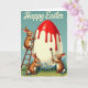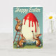 This design shows three upright, human-like rabbits working together around an oversized creamy white egg, their close spacing and attentive glances suggesting easy friendship 🐰. A wooden ladder leans against the egg as one rabbit climbs near the top, finishing a sweep of glossy deep-red paint that pours over the crown and trails downward in thick drips. Near the base, a second rabbit carefully touches up the lower curve with a small brush, while a third stands to the side as if offering quiet guidance and keeping watch 🐇. The background is a muted teal sky with soft, even lighting that makes the scene feel gentle and calm. Along the bottom, green grass spreads across the foreground, sprinkled with small blue flowers like scattered confetti 🌷. Any greeting text sits above the illustration in a simple red title, centered and spaced to leave the artwork unobstructed. The edges look lightly textured with slightly faded tones, and the red paint gleams against the smooth egg while tiny blue blossoms dot the grass below.