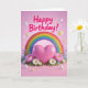 A large pink heart rests among colorful flowers beneath a bright rainbow and bright pink words that read 'Happy Birthday!'