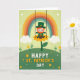 Designed with a cheerful St. Patrick’s Day scene, the card features a smiling leprechaun in a green top hat swinging from two brown ropes on the wide petals of a huge golden flower. He hugs a pot spilling with gold coins, and his bright grin gives the moment a friendly, inviting feel 💚. A soft rainbow arcs across a pale green sky behind him, adding a gentle glow to the background 🌈. Two fluffy white clouds float on either side, balancing the scene and framing the leprechaun like quiet companions. Below, rolling green hills stretch across the foreground with small yellow flowers and a few simple sprigs of foliage. The message “HAPPY ST. PATRICK’S DAY” sits prominently in the design in friendly, thick lettering, standing out clearly against the light sky. Tiny white specks, like little blossoms or stars, are scattered near the top of the card.
