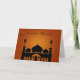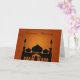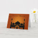 Tarjeta de Ramadán con mezquita y luna creciente con estrella contra fondo dorado y con motivos naranjas.
