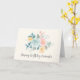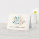 Tarjeta de cumpleaños con una bonita ilustración de acuarela. Un ramo de flores con flores rosas y azules rodeadas de hojas verdes y ramitas.